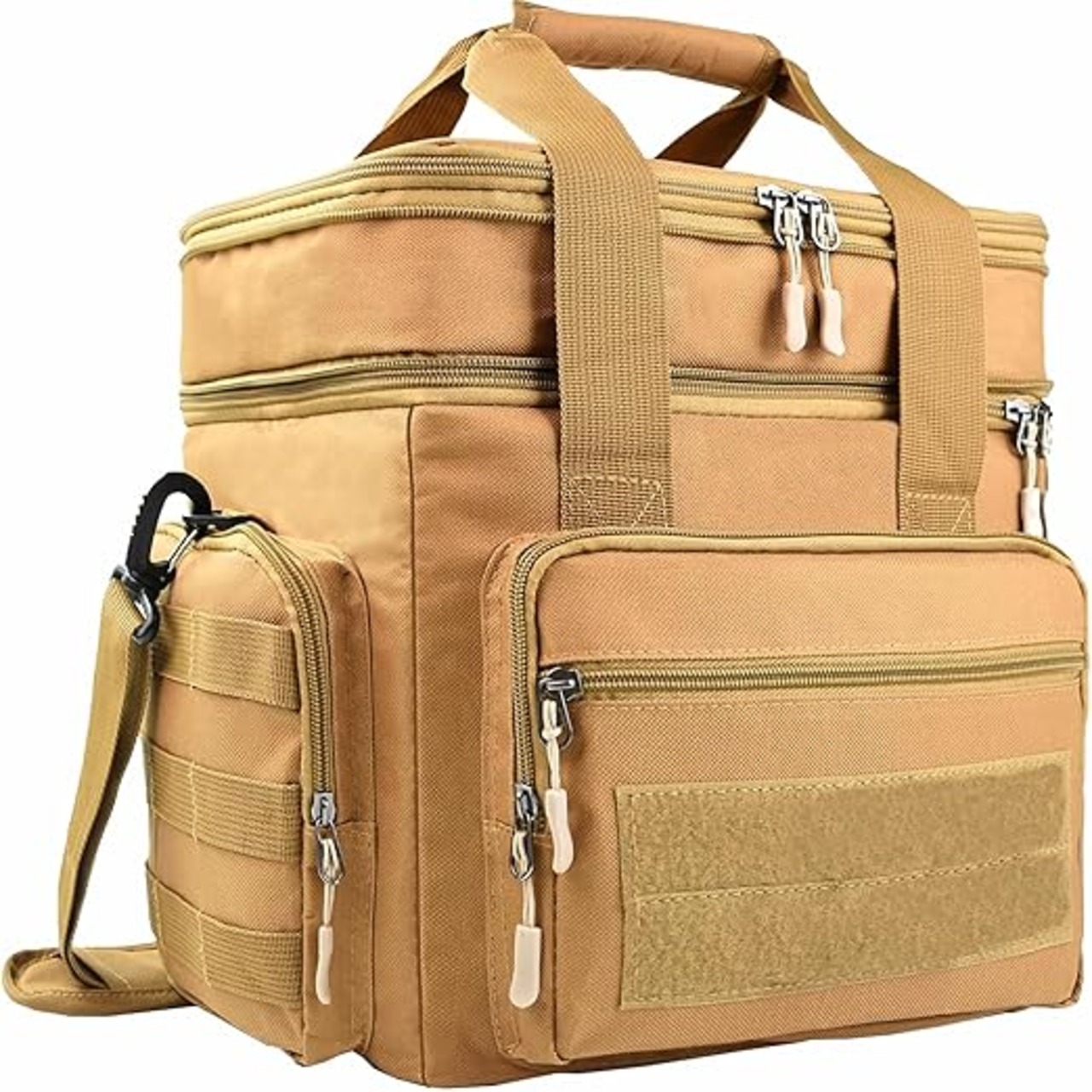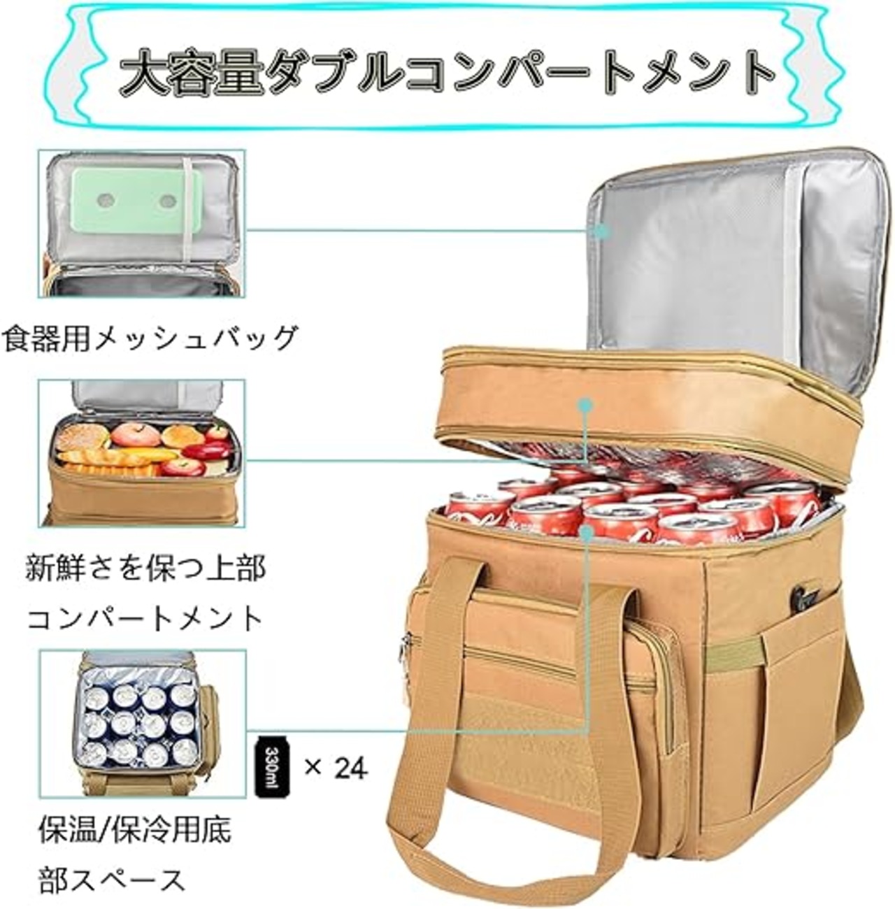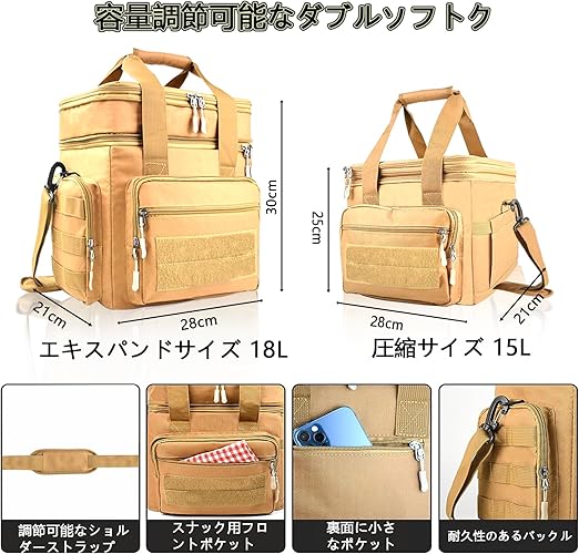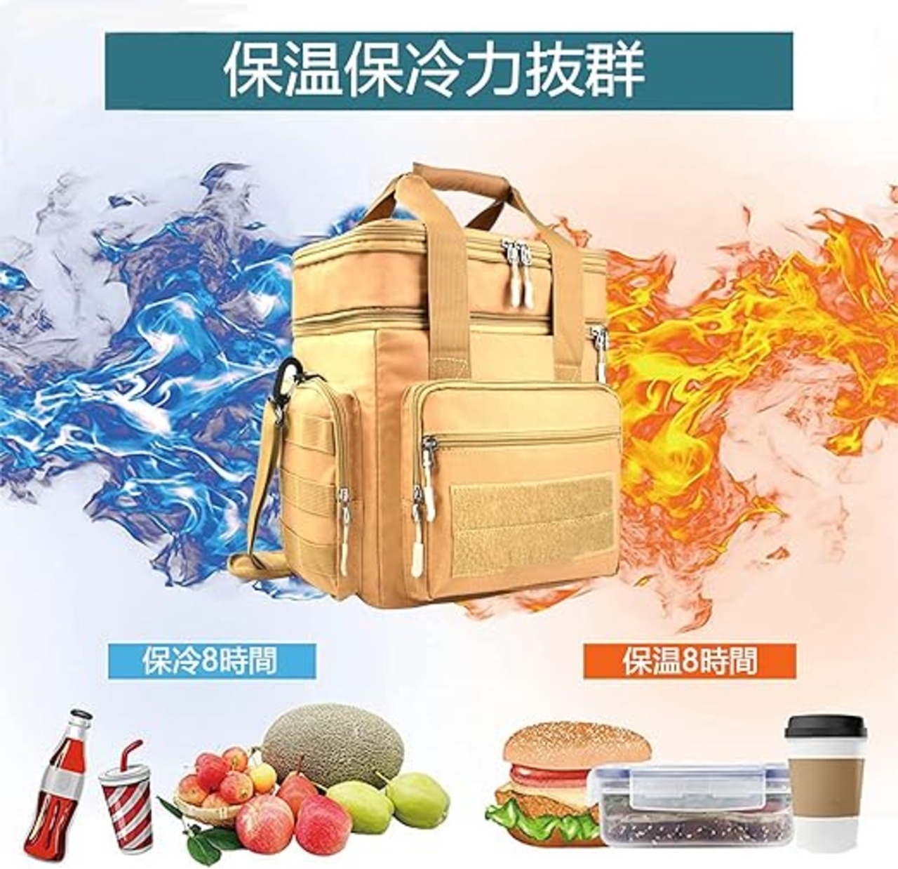 【デュアルレイヤーデザイン】: ソフトクーラーボックス、温かい食べ物や飲み物と冷たい食べ物や飲み物を分けて収納できるように、二重の分離したコンパートメントでデザインされています。 容量は18リットル(上部コンパートメントが3リットル、下部コンパートメントが15リットル)。フロントポケットにはお気に入りのステッカーを貼ることができるベルクロパネルが付き、ランチバッグのサイドにはカードや鍵、サングラスなどを収納できる複数のMOLLEウェビングポケットがある。 キャンプやピクニック、通勤などのアウトド