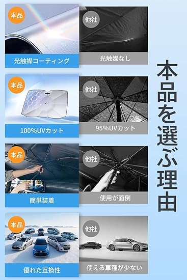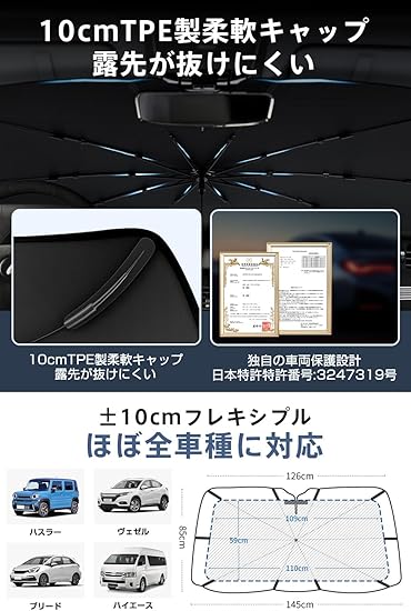 【10秒超速設置 & ほぼ全車種対応】 傘型3段折りたたみ構造なので、フロントガラスに合わせて差し込むだけの簡単設計で、たった10秒で設置完了