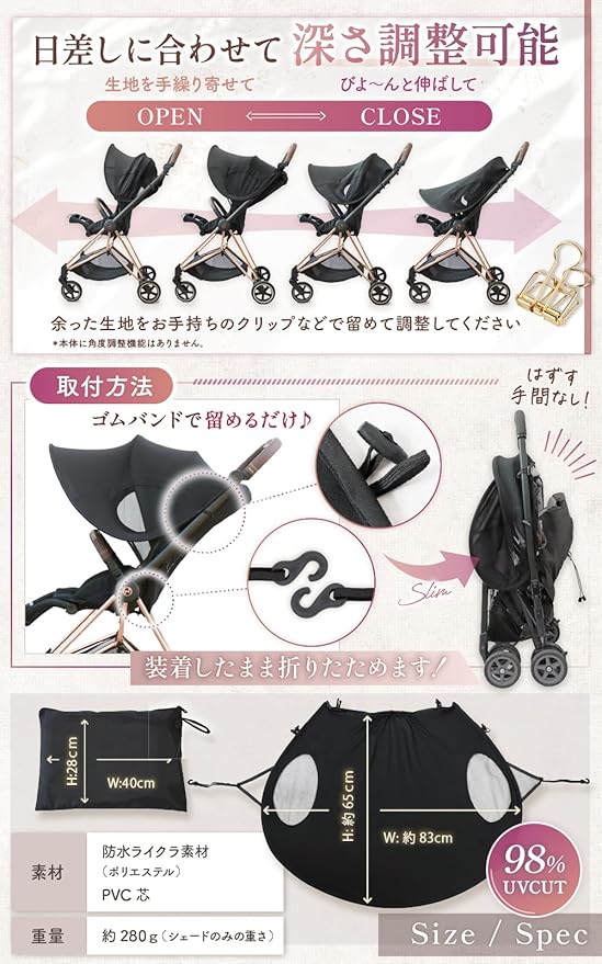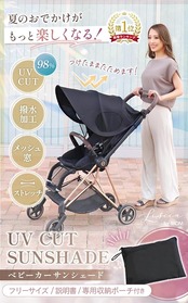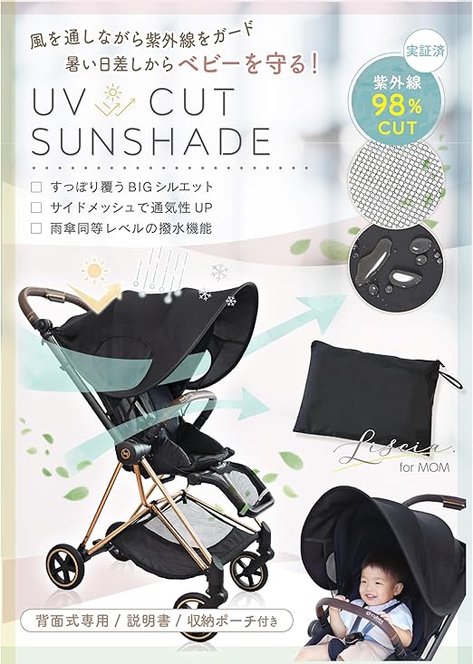【夏のおでかけがもっと楽しくなる!】98%紫外線CUTベビーカー用後付けUVカットサンシェード♪ 暑い日差しからベビーを守るBIGサイズの延長サンシェード誕生♪ 風を通しながら紫外線をガードし、厚い日差しから赤ちゃんを守ります! 【不満のある既存の日よけを大きく延長!】 日よけが小さくて顔しか隠れない、視界が隠れると赤ちゃんがぐする、風通しが悪くて熱がこもる…などのお悩みをマルっと解決!「すっぽり覆うBIGシルエット、通気性UPサイドメッシュ、小雨を防ぐ防水素材」が特徴です。A型B型のベビーカー