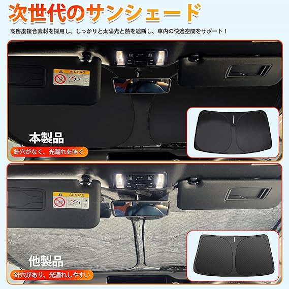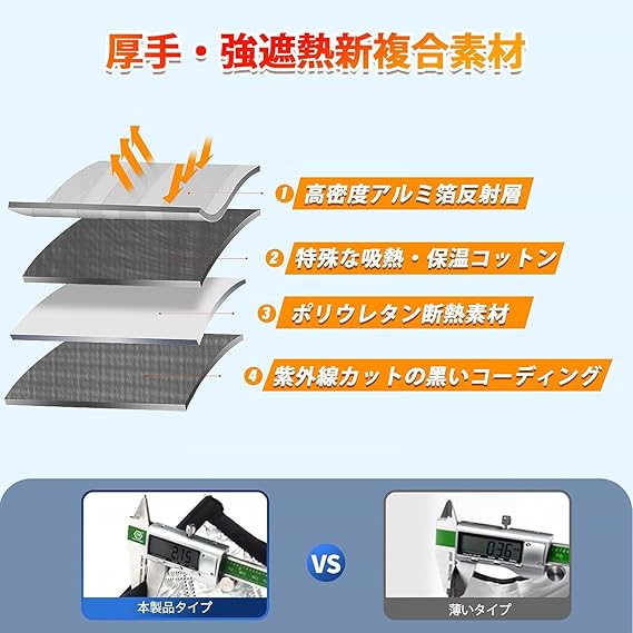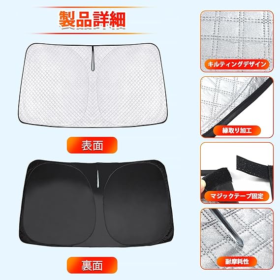 【厚手・強遮熱新複合素材】超強力遮光・断熱・夏の日除けに便利な車用サンシェードが登場!高密度の強遮熱新複合素材を採用し、柔らかくて丈夫で破れにくく、強烈な日光を跳ね返して車内の温度上昇を防げます。サンシェードの表面は洗練され