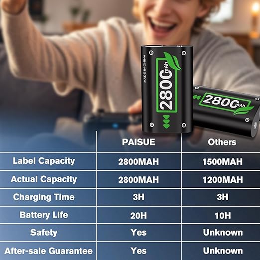 【大容量】Paisue Xbox 大容量バッテリーは他のバッテリーよりパワーがあります。グレードA+セルは、より長いバッテリ寿命と急速充電を保証し、最大1200回の高効率充電サイクルが利用可能です。より多くのバッテリー容量、より多くの使用時