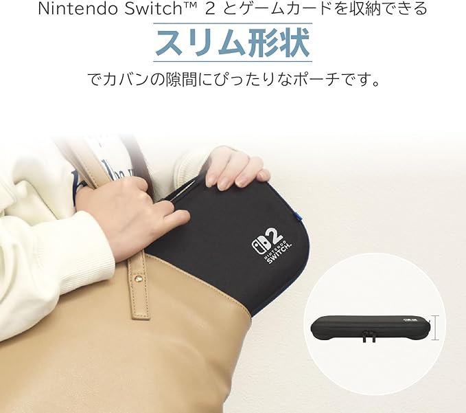 Nintendo Switch 2 とゲームカードを収納できるスリム形状でカバンの隙間にぴったりなポーチです。