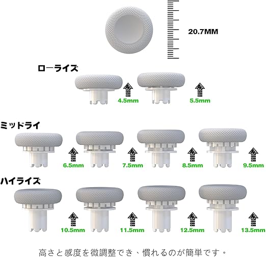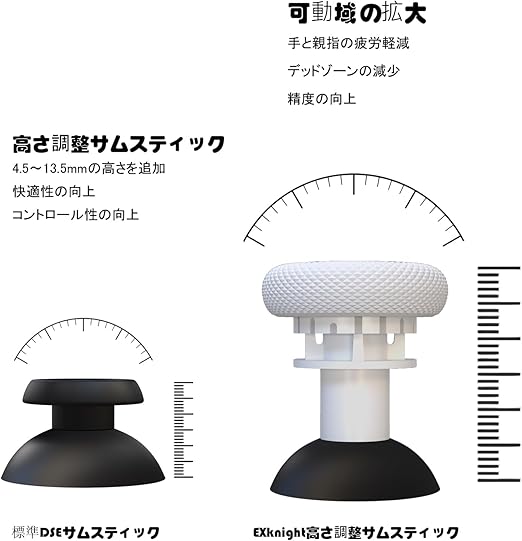 より多くの選択: 標準のデュアルセンスエッジスティックに高さを追加し、より適応しやすくなりました。追加された高さは以下の通りです: ローライズ(4.5-5.5MM); ミッドライズ(6.5-7.5-8.5-9.5MM); ハイライズ(10.5-11.5-12.5-13.5MM)。