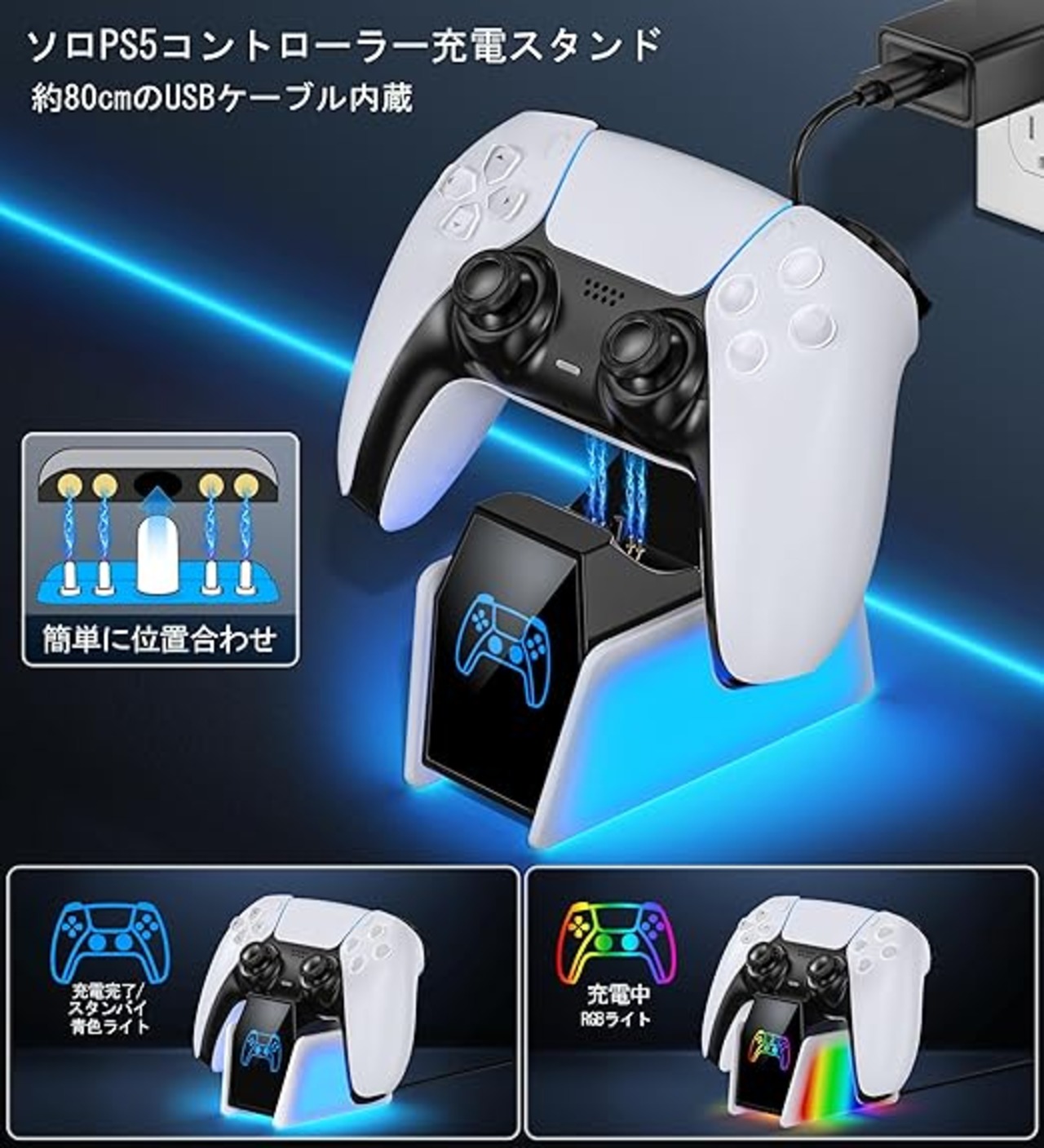 ソロ PS5 コントローラー 充電スタンド 収納スタンド 置くだけ充電 LED指示ランプ付き 過充電防止 コンパクト 軽量 PS5周辺機器 アクセサリー USBケーブル付 プレステ5 コントローラー充電器 デュアルセンスとDualsense Edgeに対応 1個入り a