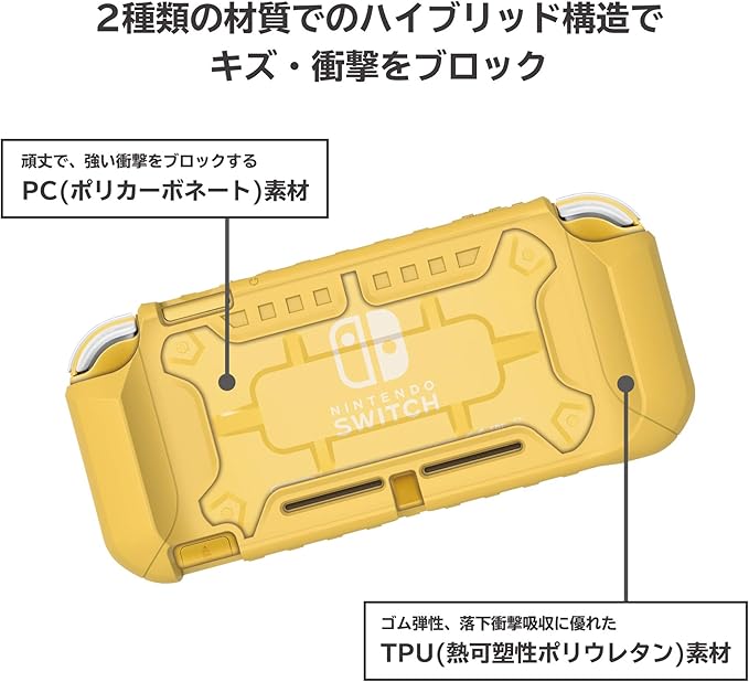 外周が軟質TPU素材でポイント衝撃に強く、背面がPC素材でケース全体の剛性を高めたNintendo Switch Lite用カバーです。