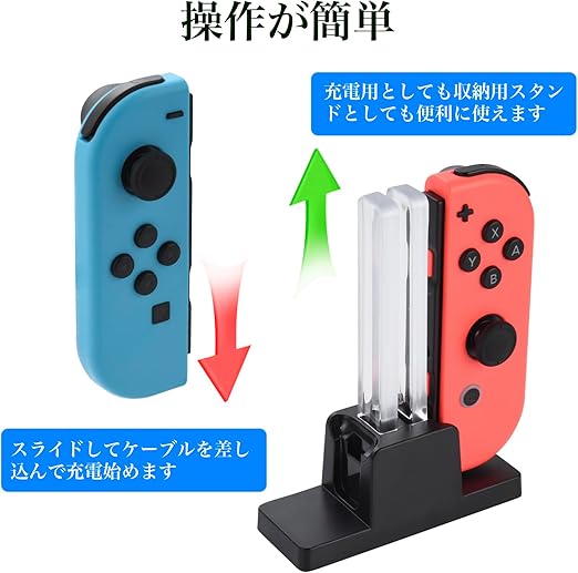 【2台同時充電】Joy-Con充電スタンドは、DC5V 800mA電力出力によりジョイコンを最大2台まで3.5-4時間急速充電できます。過充電保護回路内蔵で、ハンドルの過充電を心配する必要がありません。ハンドルを充電スタンドに差し込み、USBケーブルを電源に接続するだけで充電でき、とても便利です。