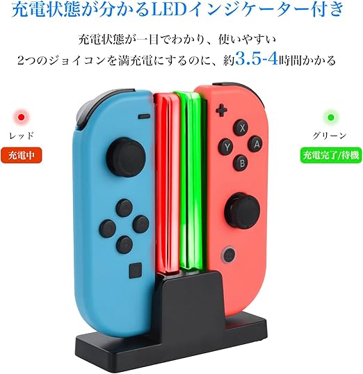 【充電指示LED付き】ジョイコン充電器の支柱のLEDライトで充電状況が一目で確認出来ます。充電中は、レッドに点灯。充電完了時は、グリーンに点灯します。