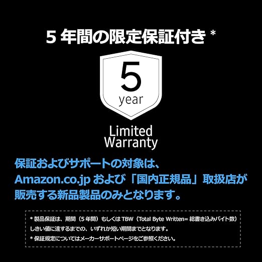 保証:5年限定保証/TBW 600TB ※いずれか短い期間まで