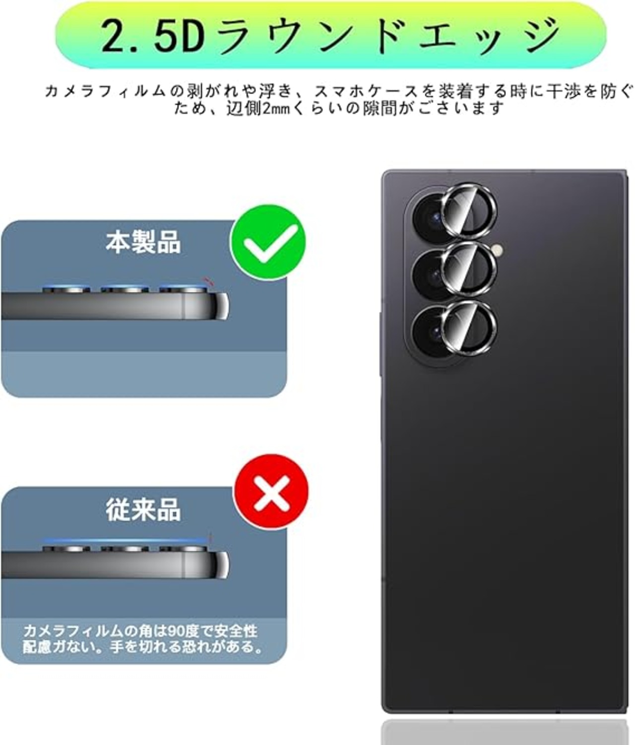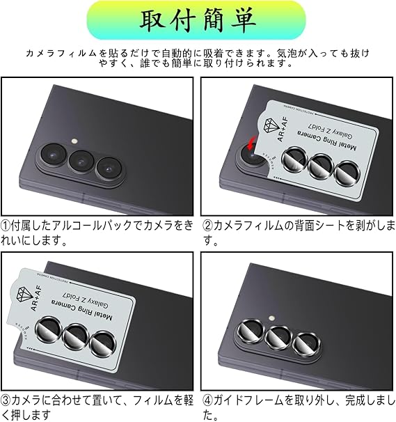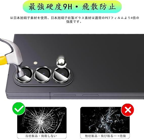 【飛散防止可能の9H硬度】 対応 ギャラクシーZ Fold 7 レンズフィルム カメラ保護フィルムはす旭硝子で作られており、レンズ保護フィルムの中で最高レベルの9H硬度に達しています。手にフィットして持ちやすく滑りにくいので落ちにくいです。万が一落ちてもカメラフィルムが衝撃を吸収してくれるので、レンズ損傷を最低限まで抑えられます。また、特殊な飛散防止設計により、ガラス