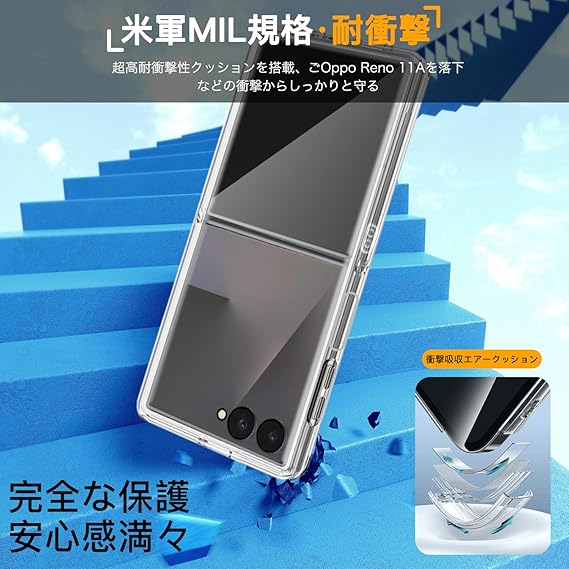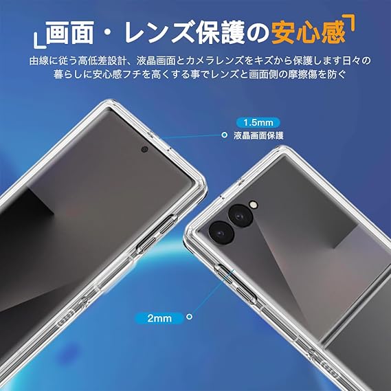 【全面保護】対応 ギャラクシー z flip 7 ケース の曲線に従う高低差設計。液晶画面やカメラレンズより高く、卓上に置いても傷がつきにくい上、背面四隅には突起があり、滑り止めに効果で、ケース背面までも傷から守れます。裏面は放熱性に優れたポリカーボネート素材を採用し、効率的に放熱し、バッテリーを完璧に保護することができます。携帯電話ケースを付けたままでもワイヤレス充電が