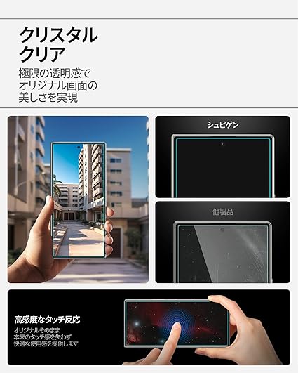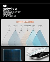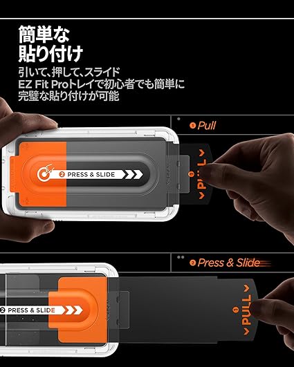 [初心者でも貼れる貼り付けキット]後面フィルムを剥がしてから貼り付けトレイと画面が平行になるように装着し、シートを引き、矢印に従ってフィルムをグッと押しつつ擦り、30秒待つだけで貼り付けが完了です。 気泡が発生しないよう、同封のクリーニングキットで液晶を拭いてから貼り付けてください。貼り付け直後の気泡は同封のヘラで押し出すことで除くことができます。 *詳しい貼り付け方法については、パッケージに記載のQRコードからガイド動画をご覧ください。