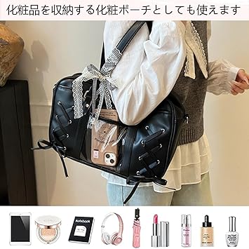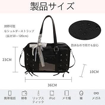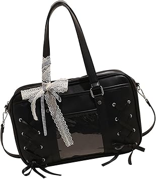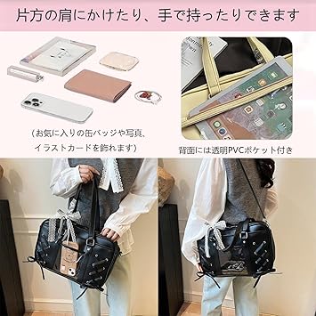 [CHAMEEN] スクールバッグ 痛バッグ 高校生 女子 通学 ボストンバッグ PUレザー リボンレーストートバッグ ティーンエイジスタイル 男女兼用 大容量 軽量 推し活バッグ a