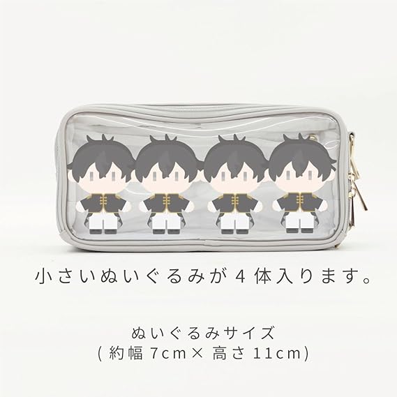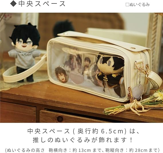 【Point3】推しの色々なグッズが収納できます。中央スペース(奥行6.5cm):推しのぬいぐるみが入ります。 (ぬいぐるみの高さ 鞄横向き:約13cmまで、鞄縦向き:約28cmまで)ぬいぐるみ(約幅7cm×高さ11cm)が約4体入ります。【Point4】付属の台座で小さなぬいぐるみも自立して入ります