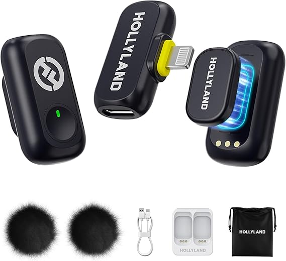 HOLLYLAND LARK A1 Mini Duo ピンマイク-ワイヤレスマイク iPhone 14/13/12 用(トランスミッター×2 + Lightningレシーバー×1)、YouTube、TikTok、ポッドキャスト、Vlogging 用マグネットマイク(ブラック、充電ケースなし) (Mini Duo Lightning(充電ケースなし)) a
