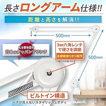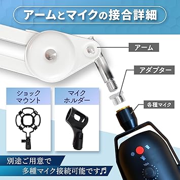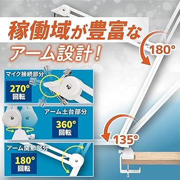 【長めアームで理想のポジションに】 通常の卓上マイクアームよりも長く設計されており、より自由なセッティングが可能。机の端から距離をとって設置したい方や、マイクを顔から遠ざけて使いたい方に最適です。収録・実況・リモート会議でも自然な姿勢を維持できます。