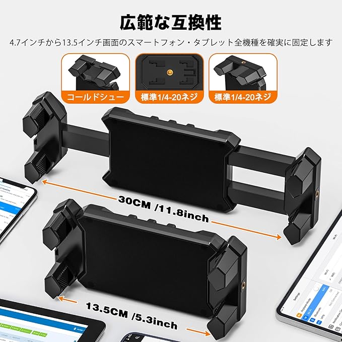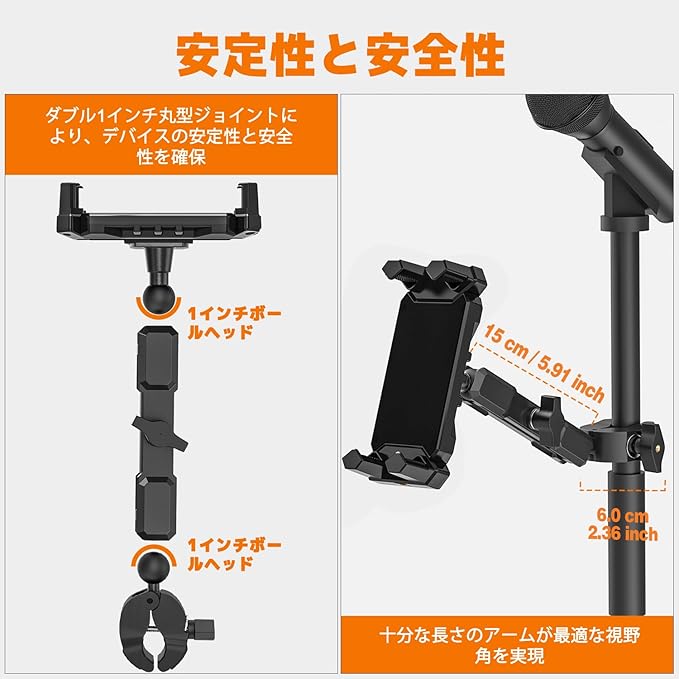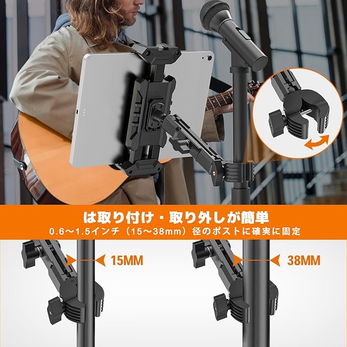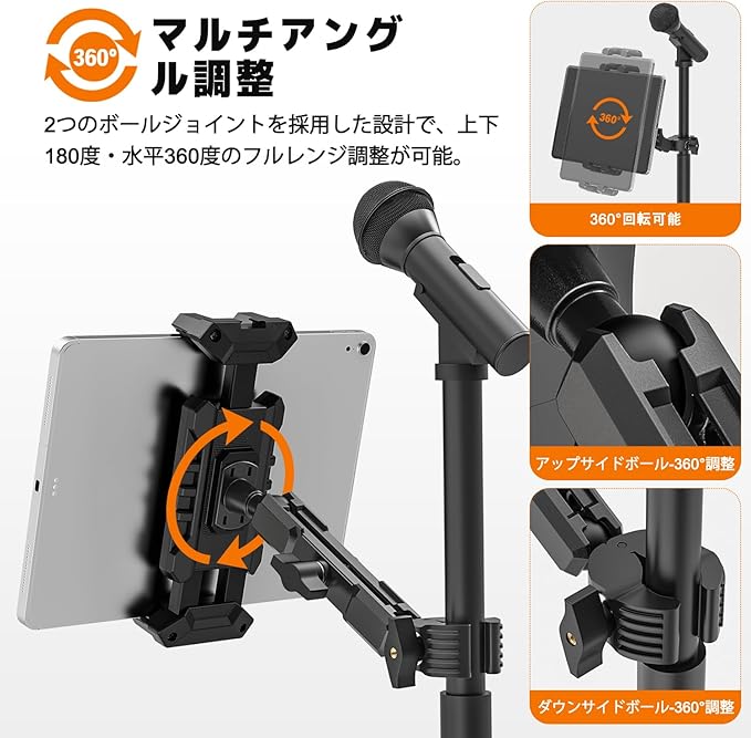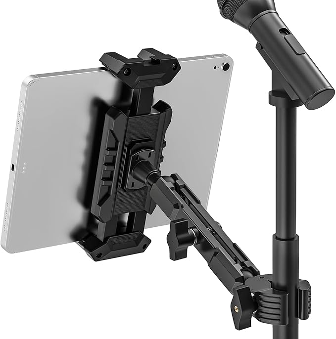 【マイクスタンド専用設計】音楽スタジオやライブ会場に最適なタブレットホルダー。マイクスタンドやブームアーム、譜面台、エクササイズバイクなどに簡単取り付け可能。iPadを最適な位置と角度に固定できるため、合唱練習や結婚式、コンサート、パーティー、会議などで楽譜や歌詞の表示、音楽再生に大活躍。プロミュージシャンからカラオケ愛好者まで幅広くご利用いただけます。