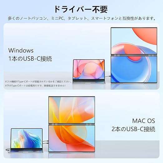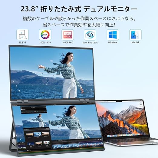 UPERFECT デュアル モバイルモニター 23.8インチ ドライバー不要 2画面ディスプレイ 自立型 デュアルディスプレイ 折り畳み FHD1080P トリプルモニター 自動回転 IPS液晶パネル フル機能Type-C MiniHDMI VESA対応 PC/Mac対応 a