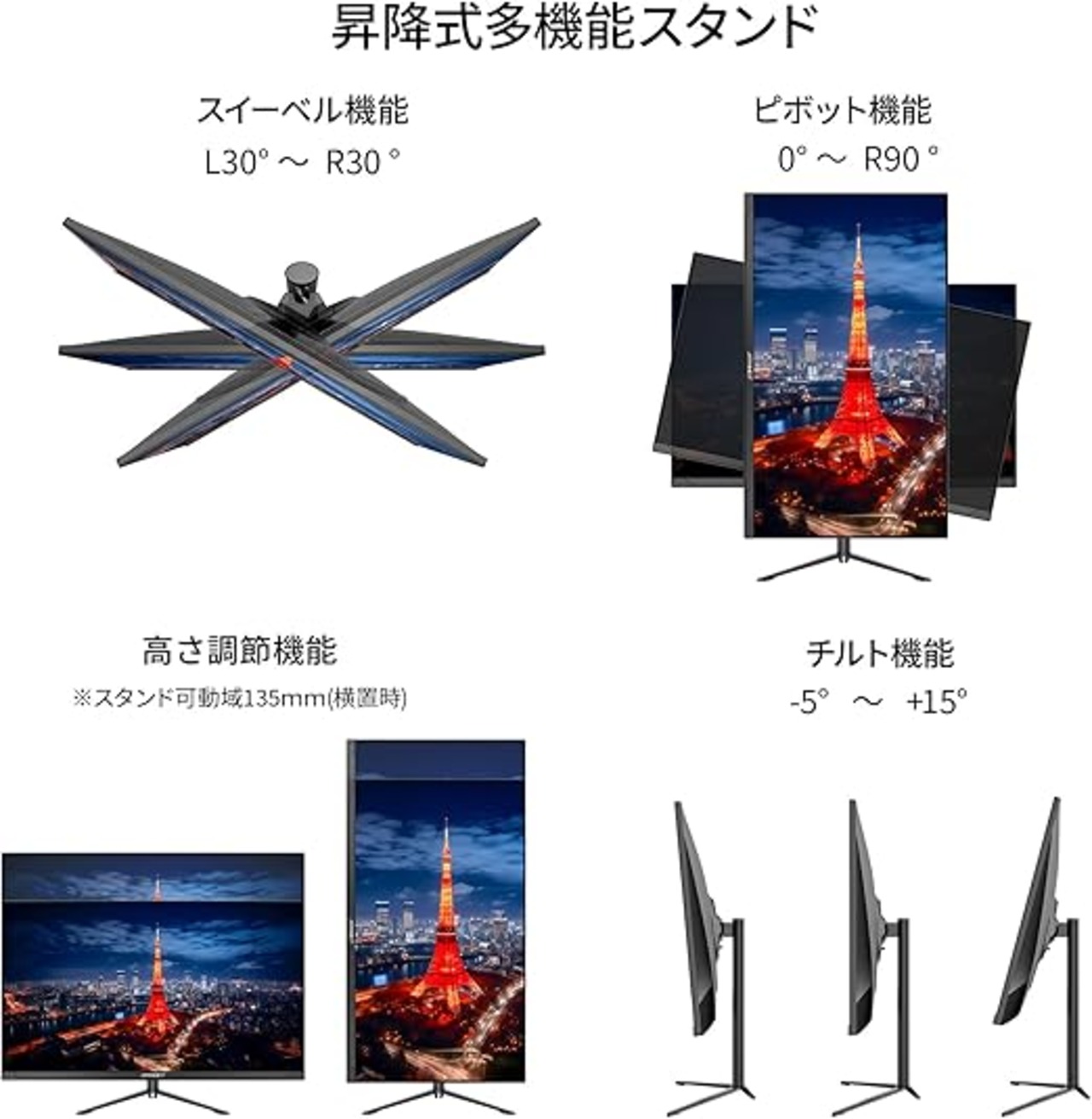 最大135mm(横置時)の範囲で高さ調整を行うことが可能な便利な昇降式スタンドを搭載。また、90度右に回転させての縦での使用も可能です。