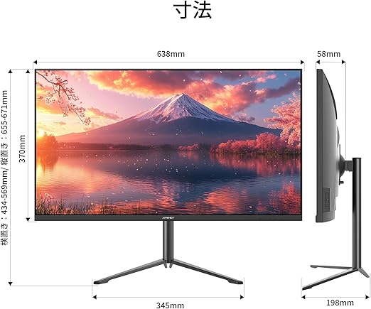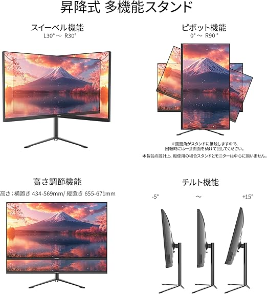 高さ調整が可能な昇降式多機能スタンドを搭載、最大135mmの範囲(横置時)で最適な高さに画面を調整可能です。また縦画面として使用出来るピボット(回転