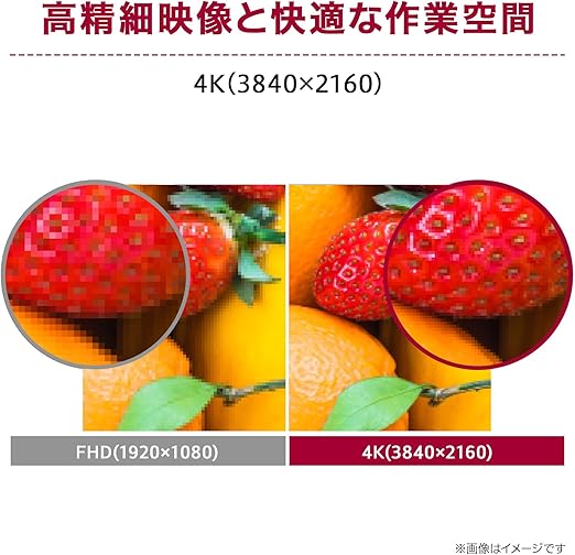 【高解像度4Kに対応】 4K フルHDの4倍の高精細な4K解像度(3840×2160)でリアルな映像度と快適で広大な作業空間を提供します。