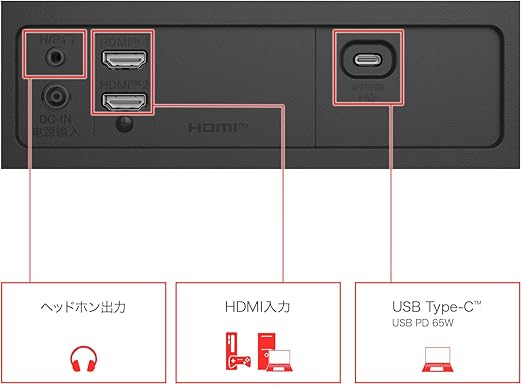 【ケーブル1本で簡単接続】 USB Type-C端子 ケーブル1本でデータ転送、映像+音声データ、給電*(USB PD 65W)が同時にできるUSB Type-C端子を搭載しています。 *USB PD(Power Delivery)に対応した機器との接続が必要です。 ※映像視聴の場合は、Alternate mode対応のUSB Type-Cケーブルが必要となります。
