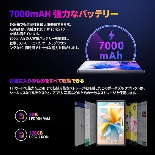 Android 14 タブレット 11インチwi-fiモデル2025新登場 CHUWI AuPad 大型タブレット、 8GB RAM+128GB+512GB microSD拡張、Snapdragon 685 8コア60Hz Widevine L1対応、 7000mAh 1920*1200 2K画面 2.4G/5GWiFi/BT5.13MP/5MPカメラ 4G LTE SIMフリー a