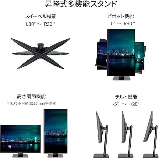 23.8インチのIPSパネルを搭載、使いやすいフルHD解像度(1920 x 1080)に対応した液晶モニターです。上下左右178度に対応した高画質IPSパネルを搭載し、コンテンツを色鮮やかに映し出します。写真編集、動画編集などにも最適です。