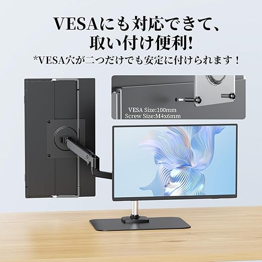 【自立スタンド付き・VESA対応】自立スタンド付きで、0°~175°の範囲内に自由調整可能!固定力十分だから、「大角度なら倒れるかも?」って心配もなく!そのうえ、底部の滑り止めゴムは四つも!自体はもう十分安定なのに、VESAまで対応可能!安定感重視ならまさにこの品一択しかないと言えるだろう!