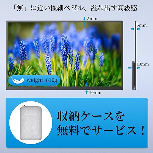 【超軽量!超薄型!超細いベゼル!】15.6インチなのに、モニター本体重量はわずかの610g、文庫本で例えると3冊ぐらい!最薄部は僅かの5mm、スマホよりも薄い!携帯性に優れており、外出時は鞄に簡単に収納でき