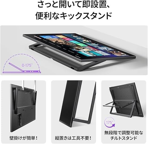 【スタンド一体型・壁掛け対応・柔軟な設置】スタンド一体型デザインで、0〜175°まで角度調整が可能。安定感があり、作業中の視認性も快適に保てます。VESAマウント対応で、壁掛けやモニターアームにも取り付け可能です。