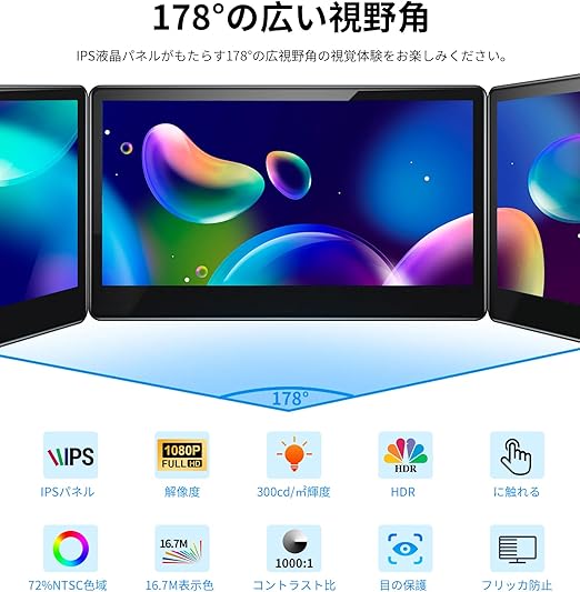 【FHD 1080P】13.3インチのタッチスクリーンモニターは、解像度1920 x 1080ピクセル、リフレッシュレート60Hz、16:9の画面比率、178°の広視野角を持つIPSパネルを採用。明るさ300cd/m²、72% NTSC色域対応で、鮮やかで正確な色再現が可能です。長時間の視聴も快適に行えます。