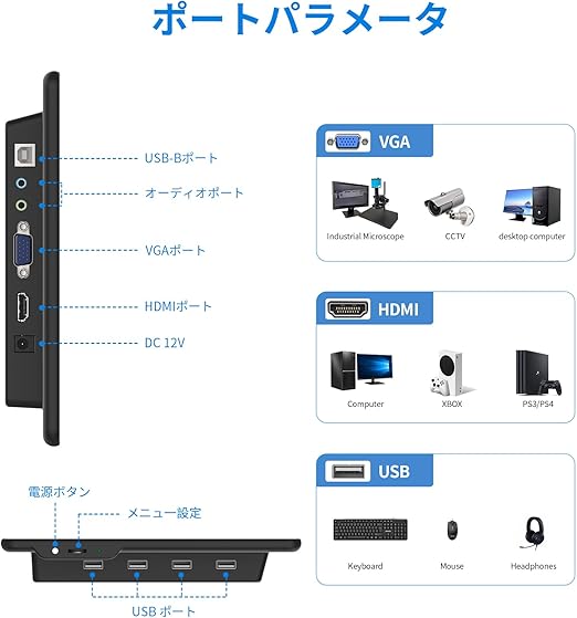 【モニター+USBハブ】モバイルモニターはHDMI/VGA接続に対応し、4つのUSBポートを備えています。USB2.0デバイスの接続をサポートし、伝送速度は480Mbpsです。デバイスポー