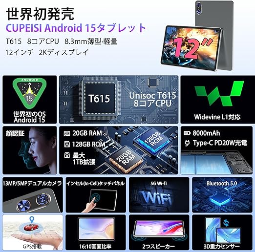 【2K画面 12インチ Android 15】CUPEISI T30 MAX Tablet タブレット アンドロイド15 T615 8コアCPU 1.8Ghz 2K IPS画面 2000*1200 Widevine L1対応 20GB+128GB+1TB拡張 8000mAh+Type-C+20W急速充電 2.4/5GHz Wi-Fi+BT5.0+ GPS 無線投影 顔認識 OTG GMS認証 a