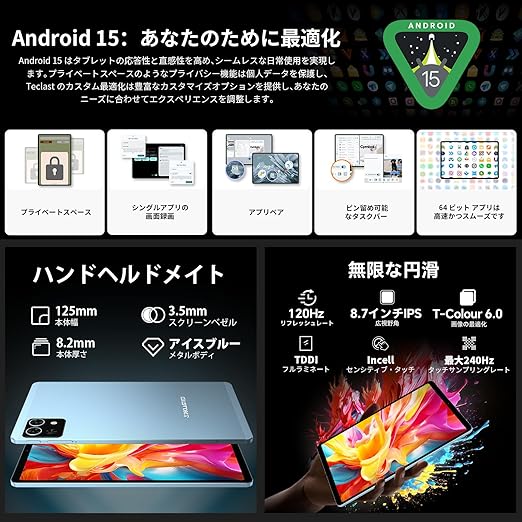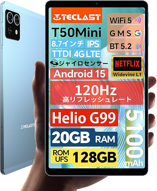 タブレット 8インチ TECLAST T50 Mini Helio G99 Android 15 タブレット 120Hz高リフレッシュレート、20GB+128GB+1TB拡張、4G LTE、ジャイロ+重力センサー+光センサー、Widevine L1+無線投影、8.7インチ IPS画面、GMS+BT5.2+GPS+OTG+デュアルスピーカー、5100mAh+Type-C、AnTuTuで約40万点+ a