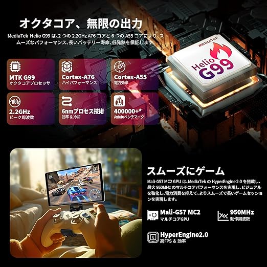 【アンドロイド15 タブレット 8インチ、高性能タブレット G99】TECLAST T50 Mini タブレット 8インチは、競争力のあるHelio G99プロセッサを搭載し、2つのA76コアと6つのA55コア、最大2.2GHzの高いクロック周波数、先進的な製造プロセス技術を採用しており、複数のアプリケーションを同時に実行する際にスムーズなスピードを提供し、発熱を大幅に減少させます。G99は強力なグラフィックス処理能力を持ち、重いゲームなどのグラフィックス密集型アプリケーションでもクリアで滑らか