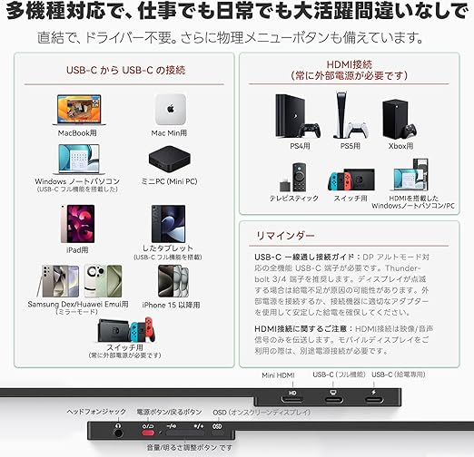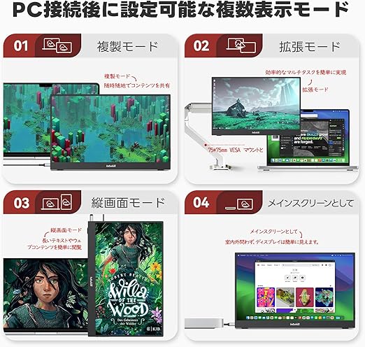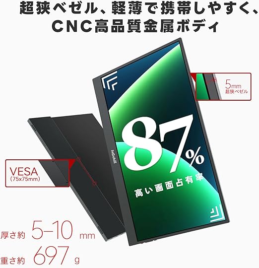 超ポータブルデザイン:このモバイルモニターなら、697gの 驚異的軽量と 5mm 超薄(最厚 9mm)アルミ合金ボディで、ラップトップと一緒にバッグに収納。付属の折りたたみ保護ケースはスタンド兼用で、卓上・膝上・壁掛け(VESA 対応)まで自在に設置し、移動中でもすぐにデュアルモニター環境を構築可能。