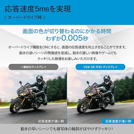 [解像度(最大)]1920 x 1080 (75Hz)、[表示色(最大)]1677万色、[応答速度]5ms (Gray to Gray) ※オーバードライブ時