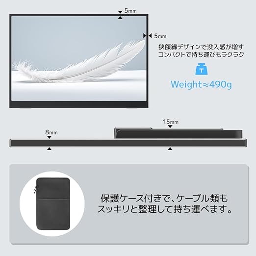 【A4サイズで持ち運び簡単】ちょうどA4用紙くらいのコンパクトサイズで、カバンにもスッと収まりす。外出先でも気軽に持ち運べ、オフィス同様のデュアルモニター環境を実現。PC画面との二画面表示で作業効率を向上させます。訪問先でモニターがなくても、資料をスマートに共有可能。どこでも快適な作業環境を構築できます。