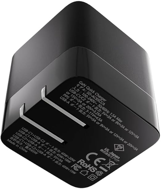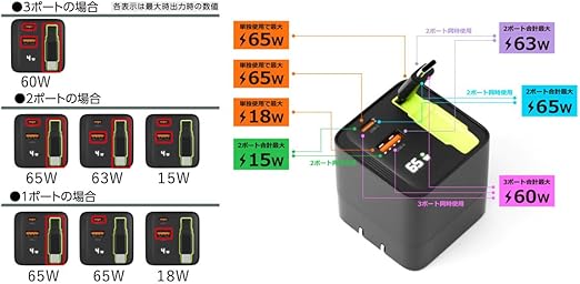 高出力で幅広いデバイスに対応 ノートパソコンからスマートフォンまで、本製品で様々な機器を充電できます。USB Power Delivery規格に対応しており、ノートパソコンなどバッテリーが大きい機器も時短で充電できます。(合計最大65Wまで)