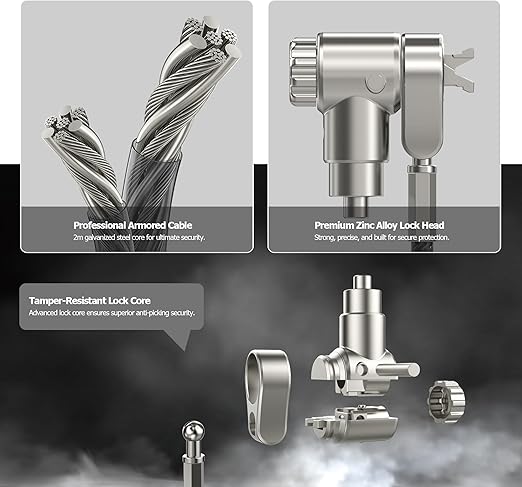 [] 工業用レベルの防犯性能:亜鉛メッキ鋼線と耐衝撃亜鉛合金ロックヘッドを採用。ビニール保護コート&強化コア構造で切断耐性を最大化し、日常使用でも劣化しません。