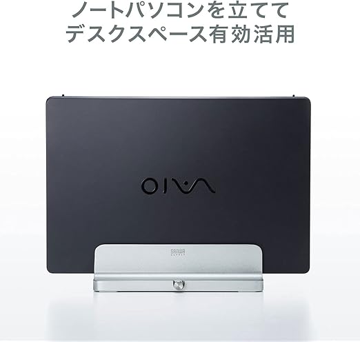 ノートパソコンの内蔵ディスプレイを閉じた状態で外部ディスプレイなどと接続して使う際に便利な縦置きタイプのアルミスタンドです。