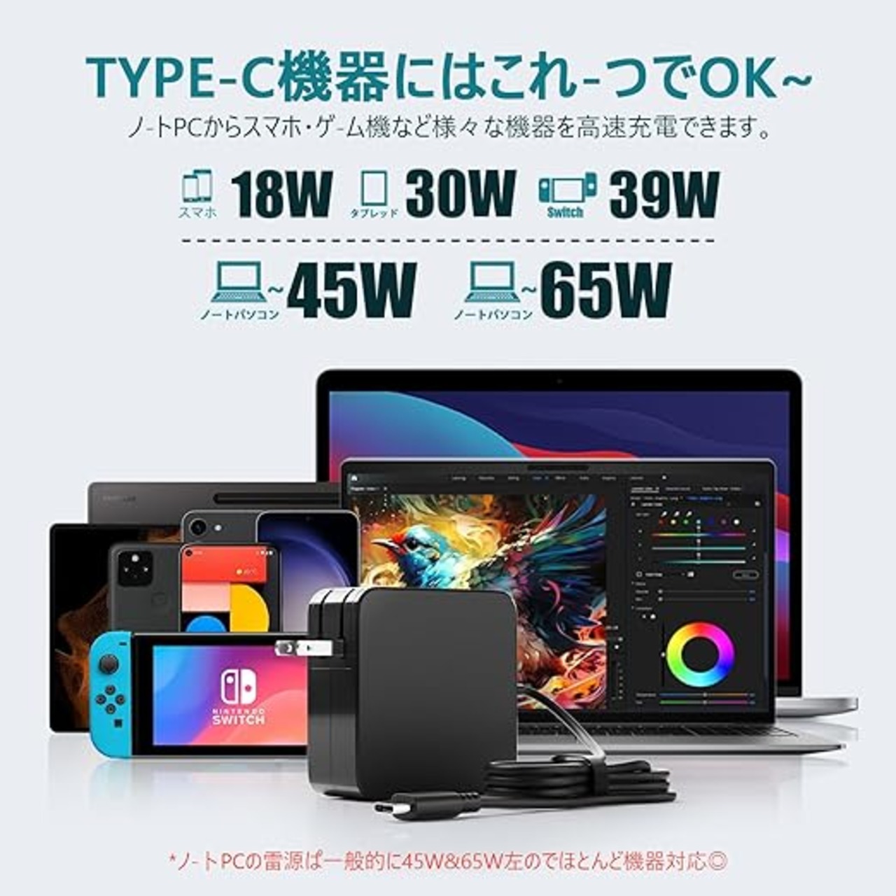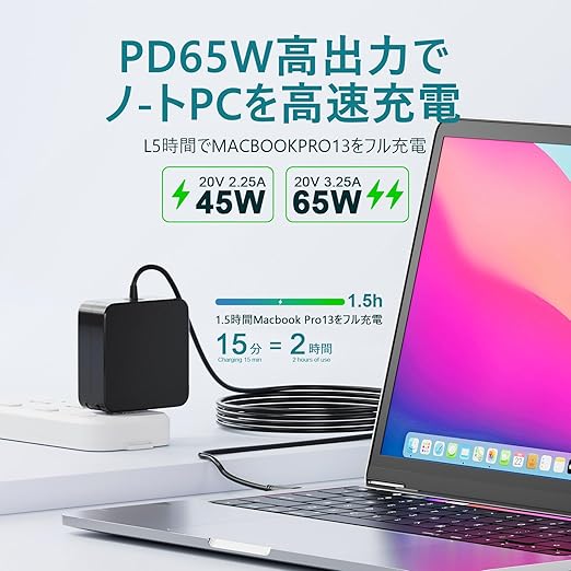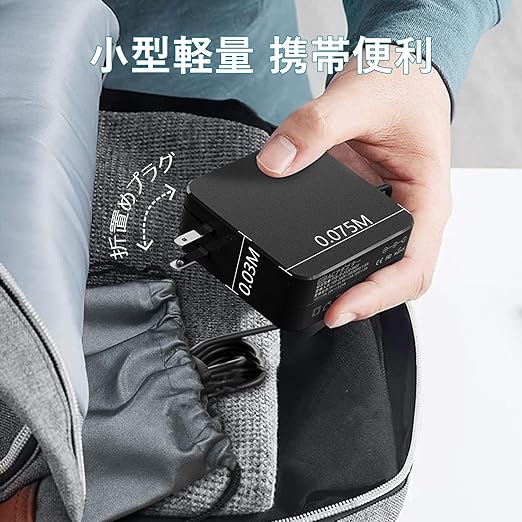 【HP ノートパソコン用 電源アダプターの商品規格】HP acアダプター純正品ではありません。交換・代替 HP acアダプターとなっております。入力:100-240V 50-60Hz 1.5A; 出力65W: 5V 3A, 9V 3A, 12V 3A, 15V 3A, 20V 2.25A, 20V 3.25A, PPS: 3.3-21V/3A;これPD対応の45W/65W タイプc充電器を備え、HP ノートパソコンからタブレット端末、スマートフォンまで幅広い機器に急速充電できます。せっかく重量の