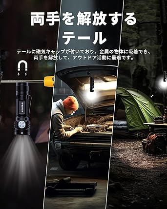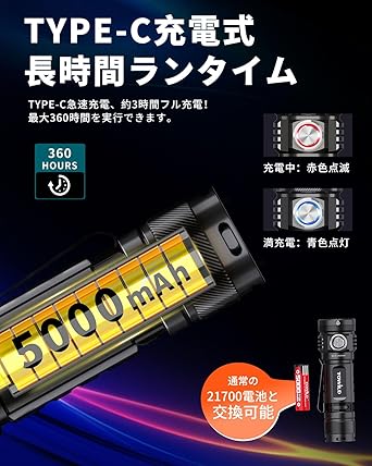 超高輝度EDC懐中電灯&USB充電式双方向インターフェース:新世代のBC10 EDC懐中電灯は4個Cree XP-G4 LEDチップを採用し、超高輝度を持ち、最大出力4000ルーメンで、照射距離は最大約145メートルに達し、車のヘッドライトみたいに明るく遠くまで照らせます。ハンディライトはUSB TYPE-C双方向出力ポートで、充電しながら点灯もできます。