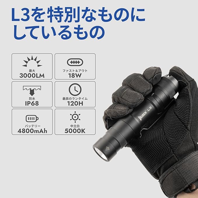 高ルーメンのフラッシュライト - WUBEN L3は、SST70 LEDから最大226メートルの範囲で3000ルーメンの光を放出し、どんな過酷な環境にも耐えられるようMIL規格の陽極酸化処理が施されています