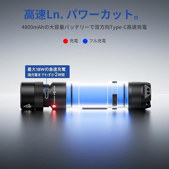 双向USB C 充电- 最大充放電電力は18Wに達し、4800mAhのバッテリー容量は2時間の充電で済みます。緊急時には、携帯電話やトランシーバーなどのデバイスに電力を供給することもでき、困難を解決する能力が高まります