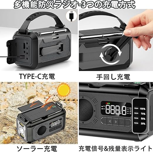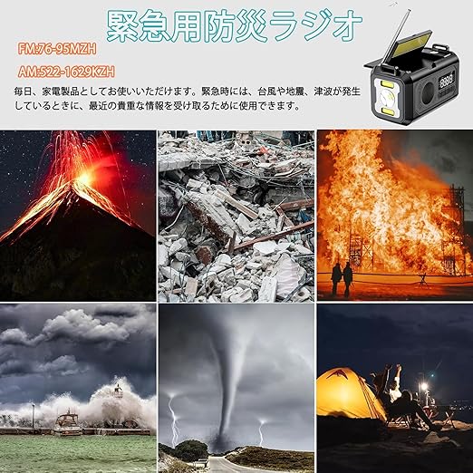 【周波数合わせやすい&受信感度高いFM/AMラジオ】:この多機能防災ラジオはAM(522-1629kHz)とFM(76-95MHz)の受信周波数に対応しています。FMラジオは場所を問わずクリアに聞こえます。この手回し充電式ラジオは、従来の手動チャンネル調整方式を採用しているだけでなく、クリアな信号受信を確実にするため、正しいチャンネルを自動的に検索する機能も追加されているます。また、360度回転アンテナを搭載しております、抜群な受信感度を実現できます。携帯ラジオが3.5mmステレオミニジャックを