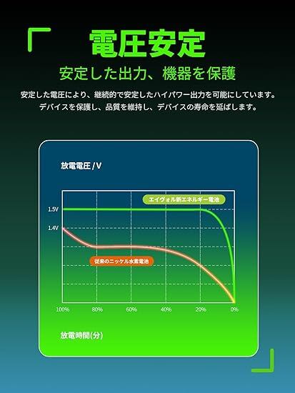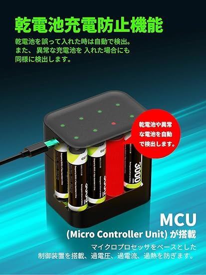 2.5時間快速充電:充電中の電圧や電池の温度を計測する「スマートチャージ」機能を備えているため、ムダな充電を減らせます。電池1本ずつに緑色のLEDが付いており、光り方で充電の状況を把握で