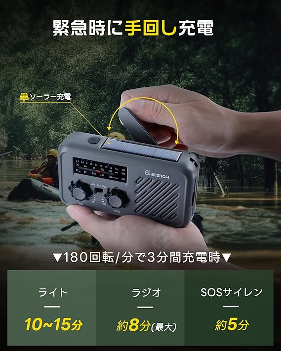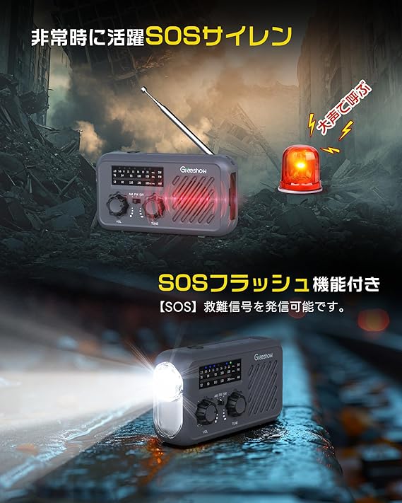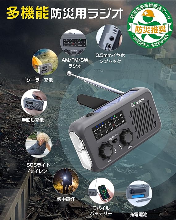 【防災協会認定品】 Greeshow 防災ラジオ 多機能 携帯ラジオ SW/AM/FM 手回しラジオ (FM周波数76Mhz-108MHz) SOSアラート付き ソーラー充電 災害ラジオ 小型 防水 3.5mmイヤホンジャック付き 2000mAhバッテリ キャンプ 緊急用 非常用 USB充電 スマホ充電可能 LEDライト PSE技術適合 防災ガイドブック付き 防災協会認定品 GS-297 a