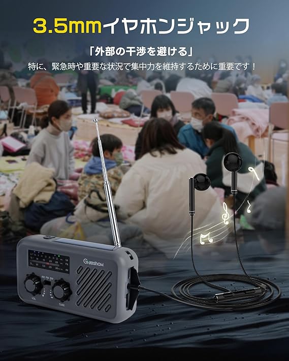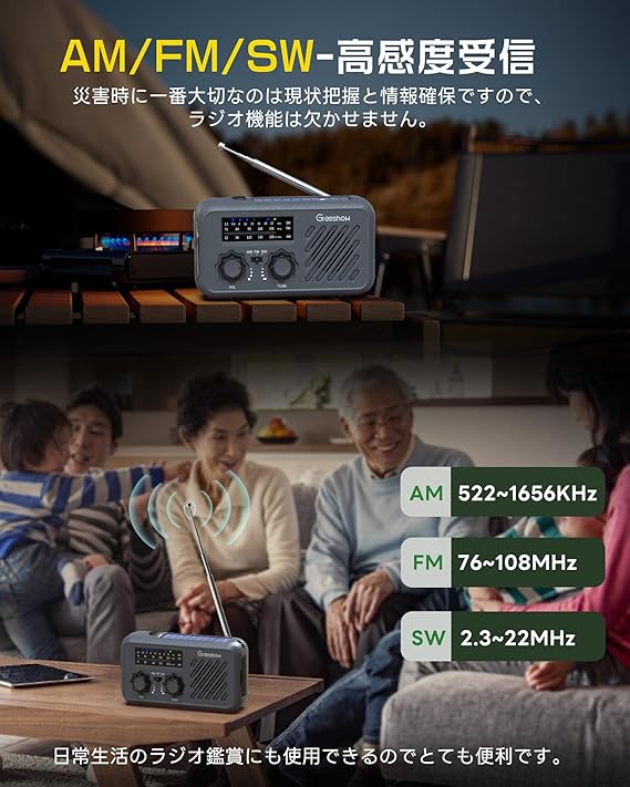 【AM/FM/SWラジオ高感度受信】GS-297 防災ラジオ、大切な家族の為の災害時の備え!AM/FM/SWラジオ(AM:522~1656KHz、FM:76~108MHz、SW:2.3~22MHz)に合わせることが出来ます。災害時に一番大切なのは現状把握と情報確保ですので、ラジオ機能はかかせません。日常生活のラジオ鑑賞にも使用できるのでとても便利です。緊急時には、台風や地震、津波が発生しているときに、最近の重要な情報を受け取るために使用できます。また、伸縮アンテナを搭載しております、抜群な受信感