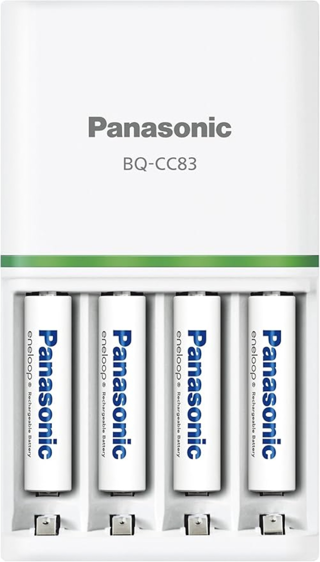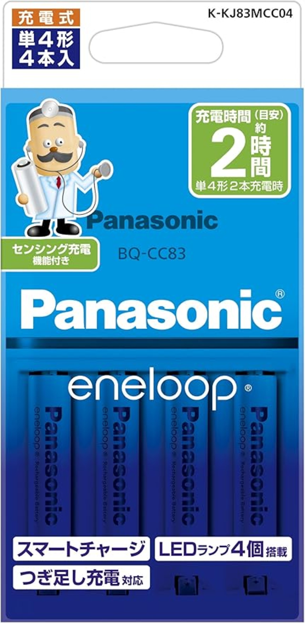 充電式エボルタ、エネループの両方の充電池に対応した「充電器 BQ-CC83」のセット(充電時間)単3形×2本を約3.5時間で充電可能単4形×2本を約2時間で充電可能